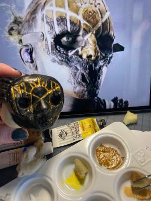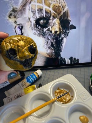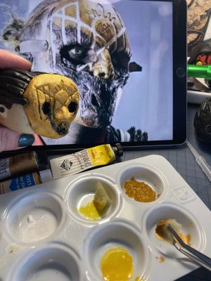 I did try to start painting iii’s mask this week but when I raided my paint stash I found no yellow or gold acrylic paint but I did have them in gouache which can work with acrylics but not in this application… Because I was itching to start I just had to try it anyway but because gouache ‘reactivates’ when other liquid, including acrylic paint, touches it and it doesn’t dry properly so your finish gets all gunked up as you disturb the initial layer. I messed around with it a bit and did actually get some good sponging practice for the texture of his mask before wiping it all off with water and cotton balls and remind myself to be patient until I went to the craft store the next day. It came off pretty easily and I secretly love the black and gold mask look! I did have to get into the cracks to get it out but it looked great as is too.