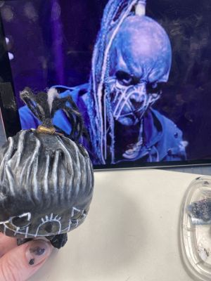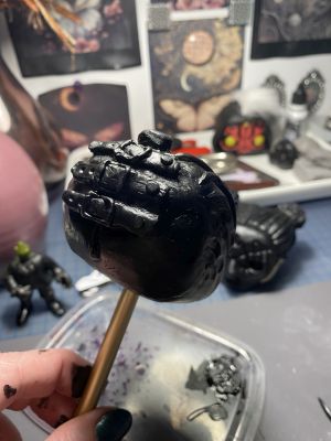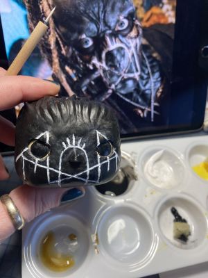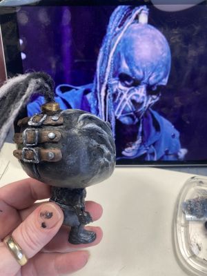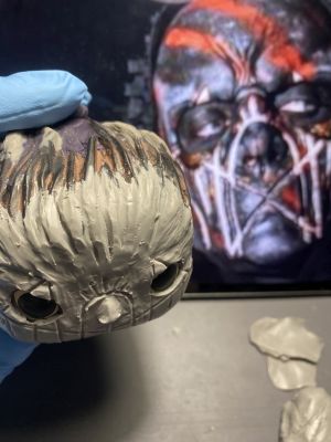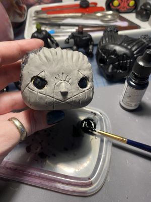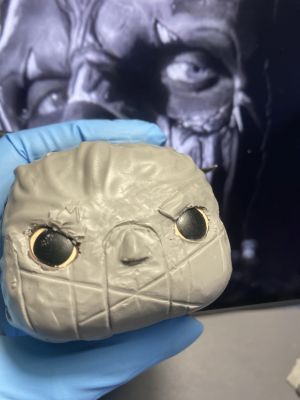 Bit of an update on ii’s build as he’s come a long way! I’ve been equal parts dreading and looking forward to this part of his face. I think I’m a bit intimidated as I haven’t done anything like this so I’m just making it all up as I’m going along so I hope it’s going to turn out OK. I roll out a thin layer of clay with the pasta machine and lay it over the face pressing it firmly into all the grooves and cut away some eye holes. It’s after I spent a bunch of time smoothing the clay that I thought I should have given the pop a little bit of a rough sand first but oh well.