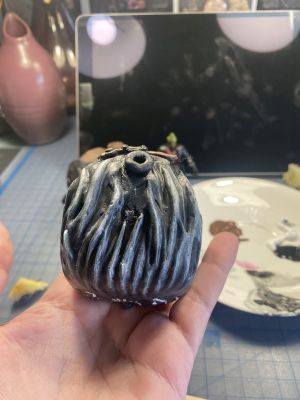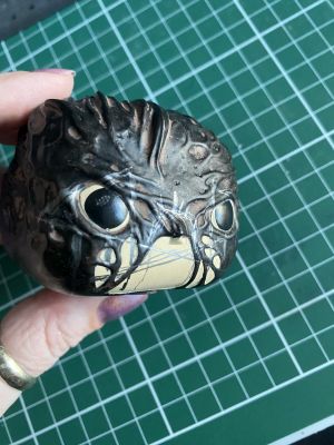 I decided to add another layer of clay to the top half so that I could better transition the fins on his head to the front of his face. I roughly marked the sigil just so I could get my proportions right as it’s so tricky to translate his mask to a rectangle! At one point I’d added some extra bulbous lumps on the tips of the eyebrows to make his brow knot but it just looked odd on the Pop’s head shape (almost like a bum haha!) so I thought I’d hint at his quizzical brow with the angles of the fins and the direction they swoop.