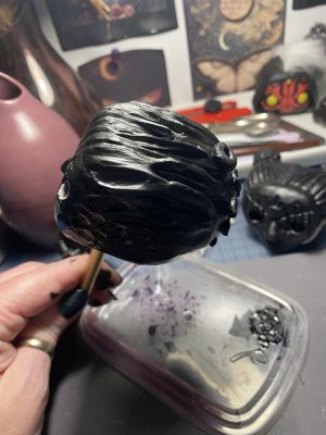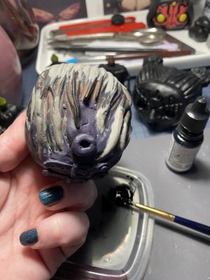 There’s a LOT of smoothing and refining on this. I tend to get in a zone and just go over and over it til it’s buttery smooth and then he went in for a 15 min bake at 130 degrees. And then it’s on to priming and painting. I used a sponge to apply to primer as I wanted to get some leathery texture to the finish. All of the masks have this lovely soft looking finish which was probably done by an airbrush which unfortunately is not in my toolkit yet. I’ve put it on my wishlist for Santa 🙂